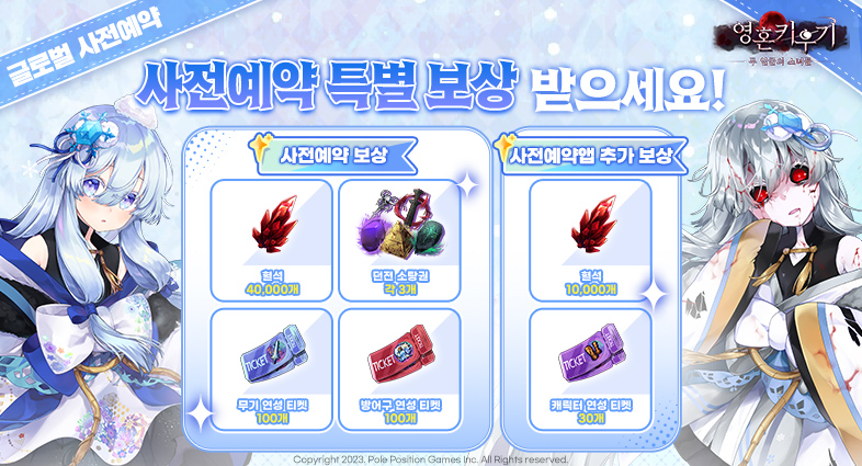 혜택 : 기본보상 : 혈석 40,000, 무기 연성 티켓 100, 방어구 연성 티켓 100, 던전 소탕권 각 3개, 추가 보상 : 혈석 10,000, 캐릭터 연성 티켓 30